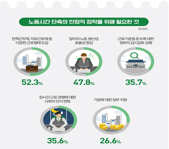 응답자들은 노동시간 단축에 따른 기대와 우려를 함께 표현했으며, 이 정책의 안정적 정착을 위해선 다양한 근로형태를 도입해야 한다고 답했다.