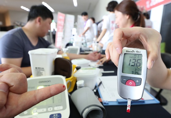 4일 오후 정부세종청사에서 심뇌혈관질환 예방관리 캠페인이 열려 직원들이 혈압·혈당·측정을 하고 있다.(사진=(c) 연합뉴스,) |