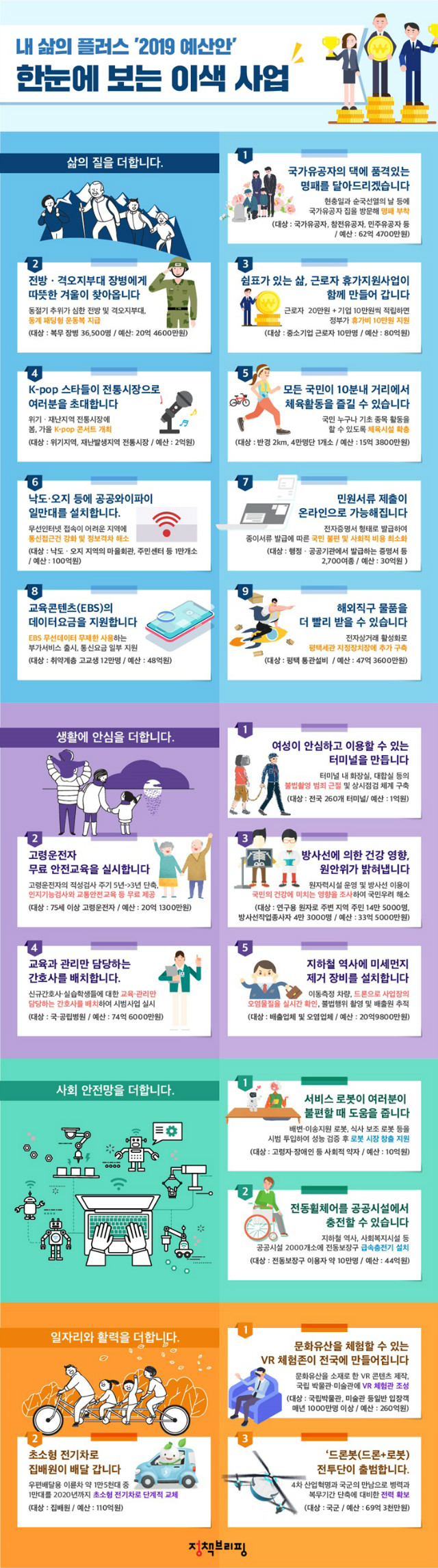 [일간환경연합 한선미 기자]지난달 28일 발표된 ‘2019년 예산안’. 내년 예산안에는 다양한 이색사업들도 담겨 있는데요. 인포그래픽을 통해 ‘2019년 예산안 특색사업 100선’ 중 주요 내용을 한 눈에 살펴보시죠.