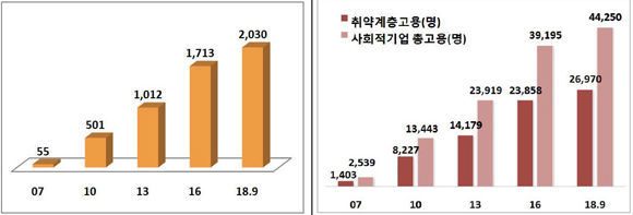 < 연도별 인증 사회적기업 현황 > < 연도별 사회적기업 고용 현황 > |