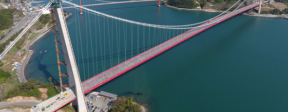 노량대교는 기존 노후된 남해대교(1973년 준공, 2차로)를 대체하는 교량으로 한려해상국립공원의 해양오염 방지와 공사비 절감을 위해 주탑(H=148.5m)을 육상에 설치했으며, 세계 최초로 경사주탑에 3차원 케이블배치의 첨단기술을 접목시킴으로써 수평저항력이 증대돼 바람에 취약한 현수교의 단점을 크게 보완했다.