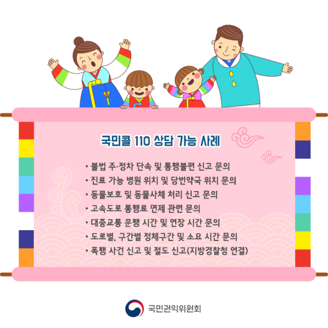 [일간환경연합 김경훈기자]추석 연휴에도 국민콜110(정부민원안내)을 통해 병원.약국 정보와 교통상황 등 생활안내 및 행정기관 관련 민원상담이 24시간 가능하다.