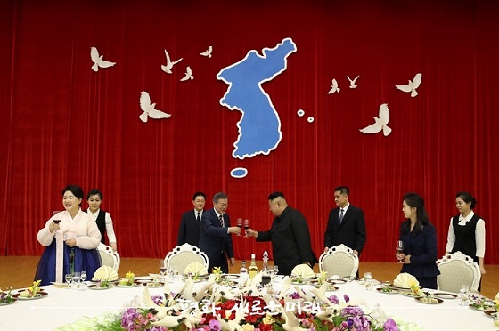 [일간환경연합 김경훈 기자]2018 평양 남북정상회담 첫날의 마지막 공식일정은 환영 만찬이었다. 환영 예술공연에 이어진 만찬은 평양 목란관에서 진행됐다.