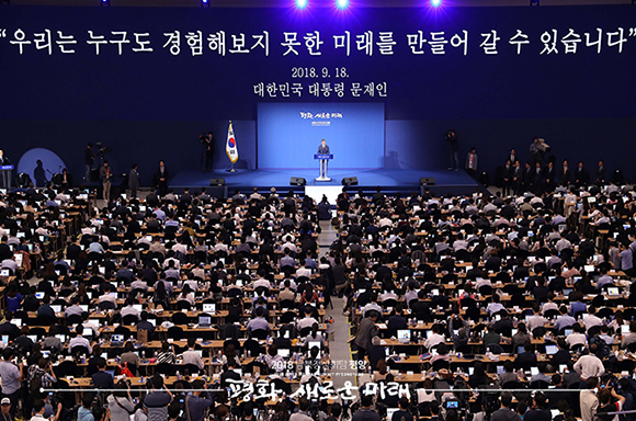 문 대통령은 “저는 ‘5월1일경기장’에서 열린 대규모 집단체조와 공연에서 15만 평양시민들에게 대한민국 대통령으로서 사상 최초로 연설을 하는 기회를 가졌다”며 “그들은 한반도를 영구히 핵무기와 핵위협이 없는 평화의 터전으로 만들어야 한다는 제 연설에 열렬한 박수를 보내줬다”고 말했다.