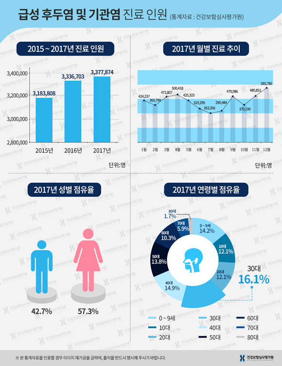 건강보험심사평가원 통계에 따르면 지난 2017년 급성 후두염 및 기관염으로 진료를 받은 인원은 337만 7874명이었습니다.