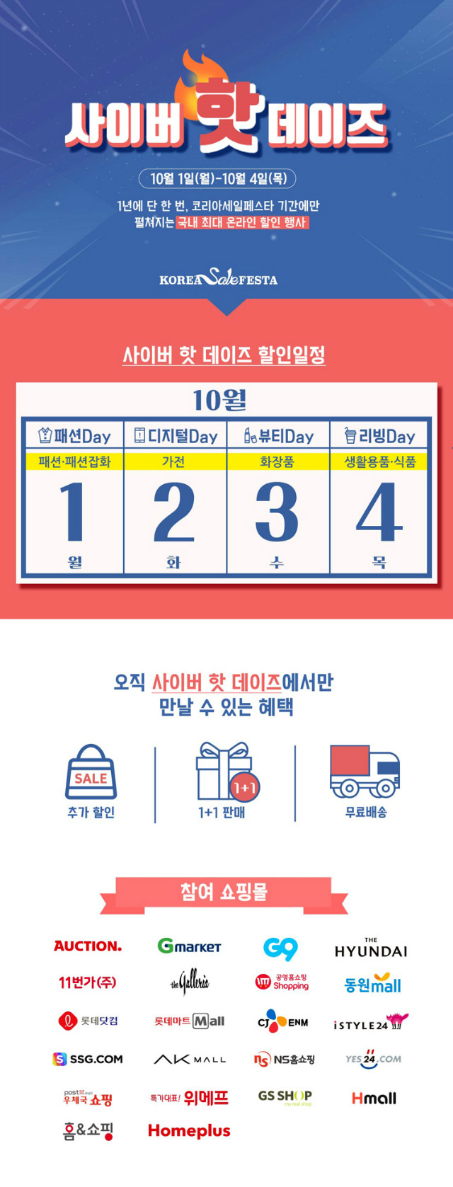산업통상자원부에 따르면 G마켓, 11번가, 롯데닷컴, CJ오쇼핑, 우체국쇼핑 등 20여 개 온라인쇼핑몰 업체와 요일별 특가전인 '사이버핫데이즈'를 개최한다고 밝혔다. 이 기간에는 요일별로 패션데이, 디지털데이, 뷰티데이, 리빙데이 등 각 주제별 특별 할인 판매된다.