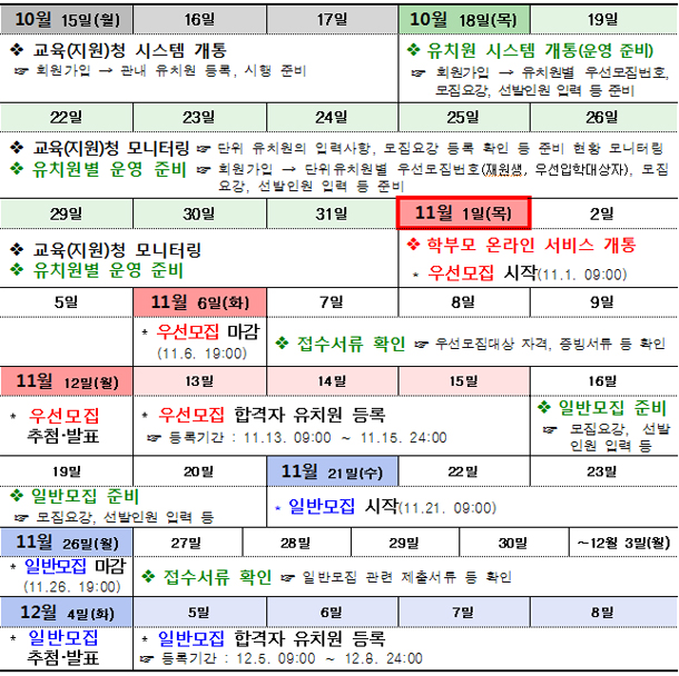 특수교육대상자, 법정 저소득층, 국가보훈대상자, 북한이탈주민 가정 유아를 위한 우선모집은 11월 1일부터 6일까지, 일반모집은 11월 21일부터 26일까지 진행된다.