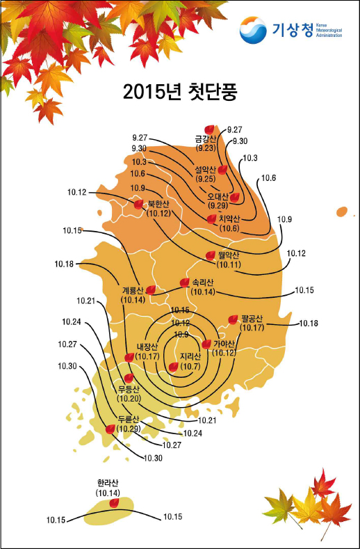 기상청은 첫 단풍이 설악산을 시작으로 중부지방은 10월 14일 사이, 지리산을 포함한 남부지방에서는 10월 7∼29일 사이에 첫 단풍을 볼 수 있을 것으로 전망된다고 17일 밝혔다.
