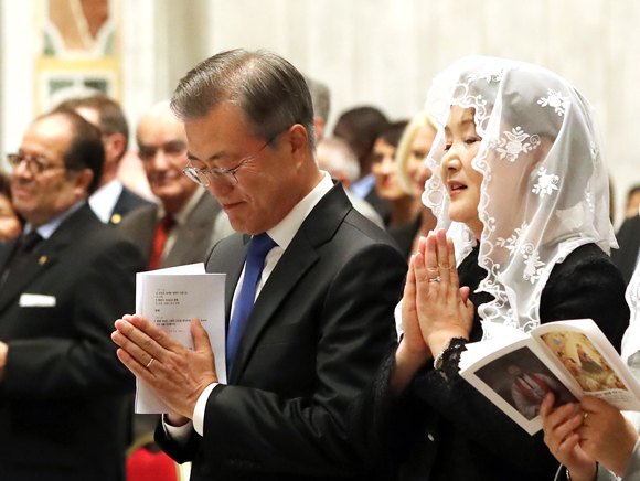 교황청을 공식 방문 중인 문재인 대통령과 부인 김정숙 여사가 17일 오후 (현지시간) 로마 성베드로 대성당에서 피에트로 파롤린 국무원장이 집전한 ‘한반도 평화를 위한 특별미사’에서 기도를 하고 있다. (사진=(c) 연합뉴스) |