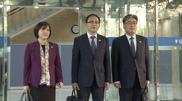 남북 산림협력 회담에 참석하는 우리측 수석대표인 박종호 산림청 차장(가운데)과 임상섭 산림청 산림산업정책국장(오른쪽), 김훈아 통일부 과장이 22일 오전 서울 종로구 남북회담본부를 떠나며 취재진 질문에 답하고 있다. |