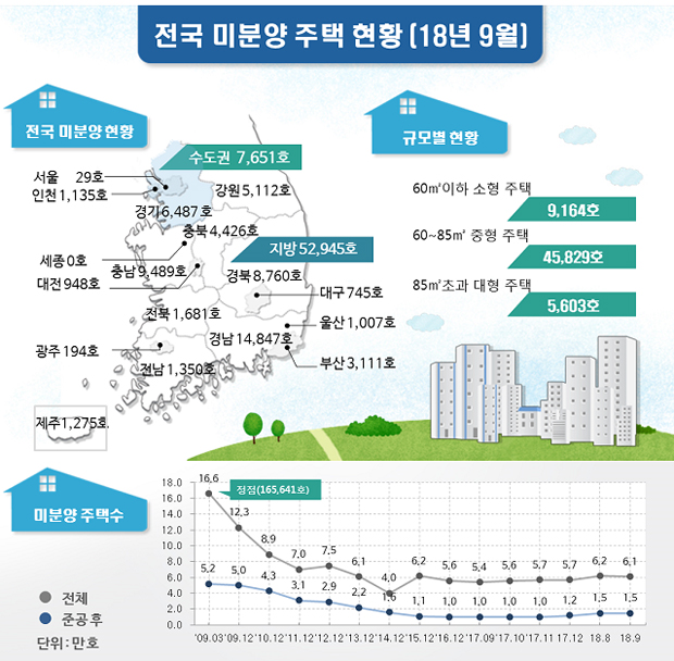 [일간환경연합 신상미 기자]국토교통부는 9월말 기준 전국의 미분양 주택이 전월(6만 2370호) 대비 2.8%(1774호) 감소한 6만 596호로 집계됐다고 30일 밝혔다.