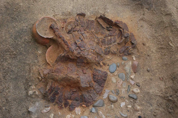토광목곽묘 서쪽에서 발견한 찰갑과 신라 토기(장경호) 모습. (사진=문화재청)이번에 발견된 유물은 직사각형 형태로 동·서 방향으로 놓인 토광목곽묘에서 발견되었다. 지금까지 확인된 규모는 길이 약 3.05m, 폭 1.4m, 깊이 25cm 정도로, 바닥에는 지름 5~10cm의 작은 돌을 사용해 시상대를 마련했다. 시상대(屍床臺)는 무덤 내부의 바닥에 시신을 올려놓기 위해 마련된 구조물이다.