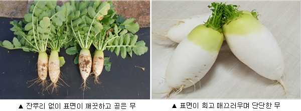 농촌진흥청 국립원예특작과학원 김대현 채소과장은 "좋은 무 고르는 방법을 잘 알아두었다가 김장 준비할 때 활용하면 싱싱한 김장용 무를 잘 고를 수 있을 것입니다."라고 전했습니다.