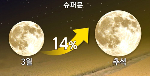 슈퍼문이 뜨는 올해 한가위는 달이 지구에 가장 가까워지는 시기로 평소 지구에서 달까지 거리(약 38만km)보다 약 2만 3000km 가깝다. 이에 따라 달에 의한 기조력(달, 태양과 같은 천체가 조석현상을 일으키는 힘) 역시 가장 크게 나타나는 것이다.