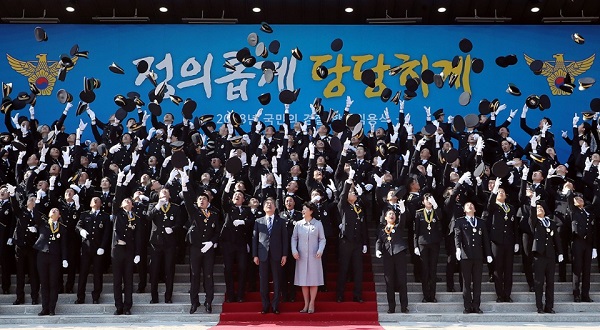 문재인 대통령 부부가 지난 3월 충남 아산 경찰대학에서 열린 ‘2018년 경찰대학생·간부후보생 합동 임용식’에서 미래 경찰 주역들인 초급 간부들과 기념촬영을 하고 있다.(사진=청와대) |