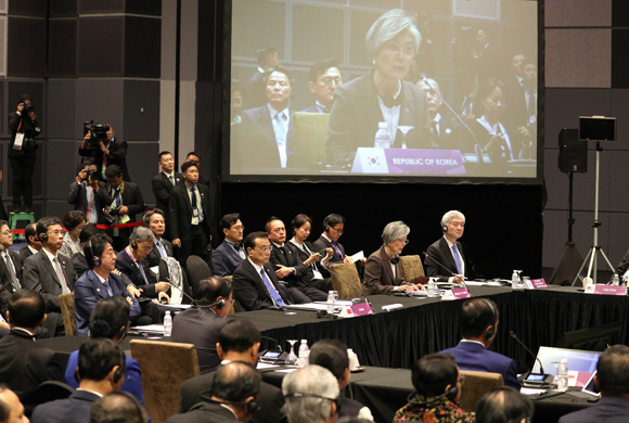 15일 오전(현지시간) 싱가포르 선텍(Suntec) 컨벤션 센터에서 열린 아세안+3 정상회의에서 강경화 외교부 장관이 문재인 대통령을 대신해 기조 발언을 하고 있다. 문 대통령은 마이크 펜스 미 부통령과의 일정이 지연돼 아세안+3 회의에 늦게 참석했다. (사진=(c) 연합뉴스) |