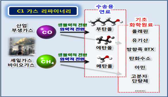 ‘C1 가스 리파이너리 기술’은 탄소 1개로 이루어진 가스(세일가스) 및 화력발전소와 제철소에서 발생하는 온실가스(CO, CH4)를 활용해 다양한 기초 화학소재 및 수송연료를 생산하는 기술을 말한다