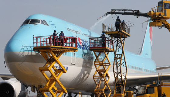 국토부는 항공사, 교육기관과 협업을 통해 운영한 ‘B737 기종 정비특화과정’ 제1기 수료생 중 81%가 항공사에 취업했다고 21일 밝혔다. 사진은 인천공항 대한항공 정비 격납고에서 보잉 747-8i 차세대 항공기의 동체 세척작업을 하는 모습.(사진=(c) 연합뉴스)