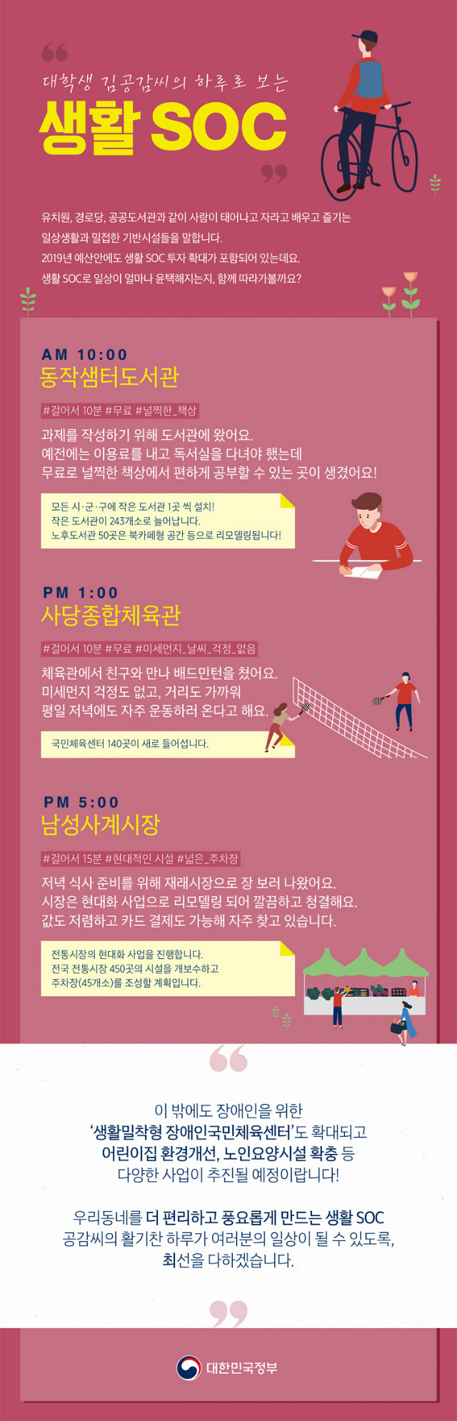 [일간환경연합 한선미 기자]유치원, 경로당, 공공도서관과 같이 사람이 태어나고 자라고 배우고 즐기는 일상생활과 밀접한 기반 시설들을 말합니다. 2019년 예산안에도 생활 SOC 투자 확대가 포함되어 있는데요. 생활 SOC로 일상이 얼마나 윤택해지는지, 함께 따라가볼까요?