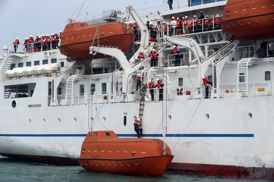 부산 해경 전용부두 앞 해상에서 민관군이 합동으로 해양사고 실전 대응력을 높이는 인명구조 훈련을 벌이고 있다.(사진=(c) 연합뉴스) |