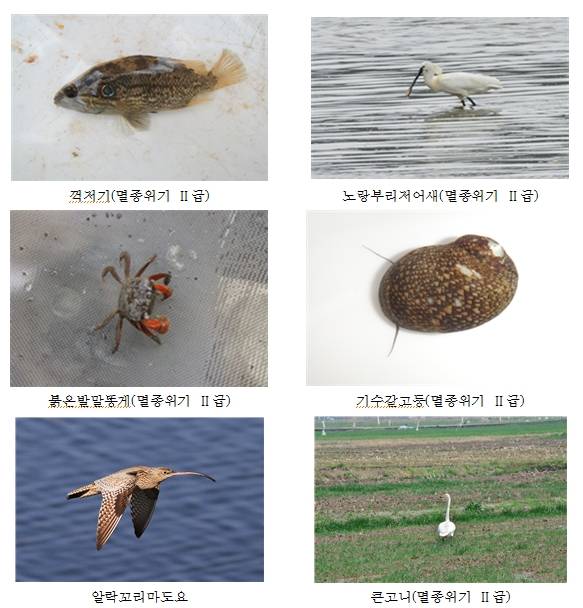 발견된 멸종위기 야생생물 Ⅰ급은 수달이며 Ⅱ급은 알락꼬리마도요, 큰기러기, 큰고니, 노랑부리저어새, 삵, 꺽저기, 기수갈고둥, 붉은발말똥게 등이다.