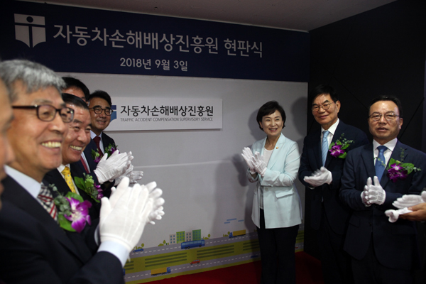 지난 9월 3일 서울 영등포구에 개원한 자동차손해배상진흥원에서 김현미 국토교통부 장관 등이 현판을 제막하고 있다. (사진=국토교통부) |