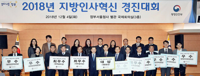 행정안전부는 4일 정부서울청사에서 ‘2018년 지방인사혁신 경진대회’를 열고 채용, 교육·훈련, 성과평가, 근무혁신 등 인사제도가 우수한 지자체를 선정해 시상했다고 5일 밝혔다.