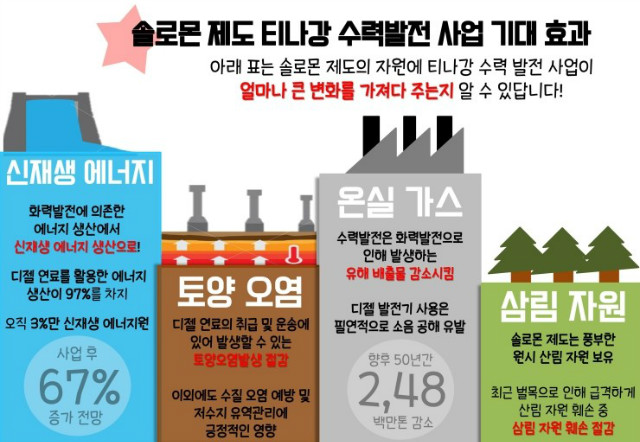 [일간환경연합 한선미 기자]환경부 산하 한국수자원공사(사장 이학수)는 12월 6일(한국 시각) 오전, 솔로몬제도의 수도인 호니아라에서 솔로몬제도 정부와 2억 1,100만 달러(약 2,400억 원) 규모의 '솔로몬제도 티나강 수력발전사업' 계약을 체결한다.