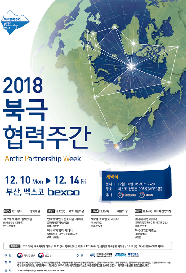 해양수산부와 외교부는 10일부터 14일까지 부산 벡스코 컨벤션홀에서 ‘2018 북극협력주간(Arctic Partnership Week 2018)’을 개최한다.