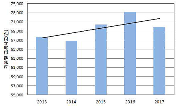 이렇듯 폭설이나 한파로 인한 도로 노면의 결빙은 겨울철 교통사고의 큰 위험 요소 중 하나다. 특히 이상기후와 산악지형이 많은 지형적 특성으로 우리나라의 겨울철 교통사고는 증가하고 있으며, 도로 결빙 시 교통사고율에 비해 치사율이 가장 높다는 점에서 문제의 심각성이 크다.