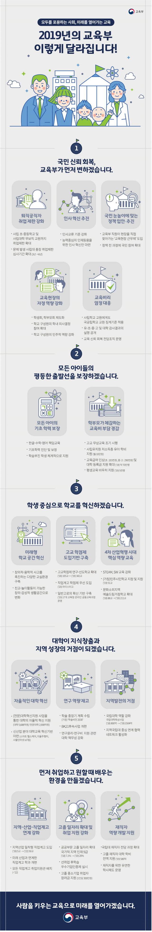 혁신적 ‘포용국가’로 나아가기 위해 개인의 선택과 성장을 지원하는 2019년 교육부 주요 업무계획을 국민께 보고 드립니다. 인포그래픽으로 확인해보세요.