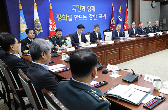 이날 문 대통령은 국방부의 업무보고에서 “작년까지 한반도는 긴장·대치로 일촉즉발의 전쟁위기 상황이었지만, 불과 1년 만에 남북이 한반도 전쟁 종식을 선언하고 대화를 통한 평화 시대를 열었다”면서 “내년에는 흔들리지 않는 항구적인 평화를 정착해야 한다”고 강조했다.