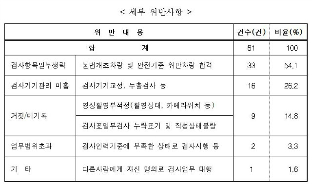 특별점검 결과, 불법 개조(튜닝)차량 및 안전기준 위반차량 합격처리 33건(54%), 검사기기 관리미흡 16건(26%), 영상촬영 부적정 및 검사표 작성 일부 누락 9건(15%) 등 61곳 검사소 1곳 당 1건의 불법행위가 있었다.