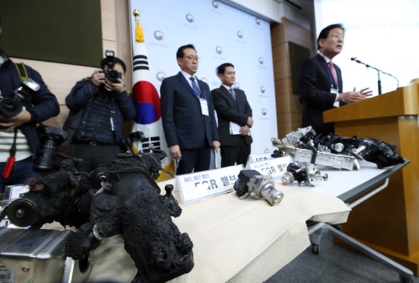 24일 오전 서울 종로구 도렴동 정부서울청사에서 김경욱 국토교통부 교통물류실장과 박심수·류도정 민관합동조사단장이 BMW 화재 원인 최종 결과를 발표하고 있다.민관합동조사단은 EGR쿨러 균열로 인한 냉각수 누수가 화재 발생원인이나 EGR 설계결함으로 냉각수 끓음 현상(보일링)을 확인했다고 밝혔다.(사진=(c) 연합뉴스) |