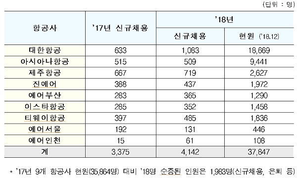 9개 항공사는 지난해(약 3375명) 대비 약 23% 증가한 4142명을 올해 신규 채용해 항공산업 성장과 양질의 일자리 창출을 견인했다. 항공사별로 보면 대한항공 1083명, 아시아나 509명, 제주항공 719명, 진에어 437명, 에어부산 365명, 이스타항공 352명, 티웨이항공 485명, 에어서울 131명, 에어인천 61명 등이다.