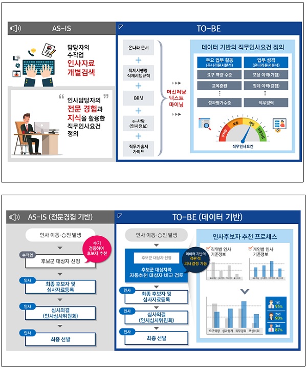 전자문서와 직위가 속한 각 부처의 기능분류 정보를 분석해 직위의 업무활동, 업무성격을 도출하고 직위 대상자의 보직경로, 역량평가, 성과 정보 등 인사정보를 활용·분석해 직무에 필요한 인사 요건이 만들어지도록 했다.