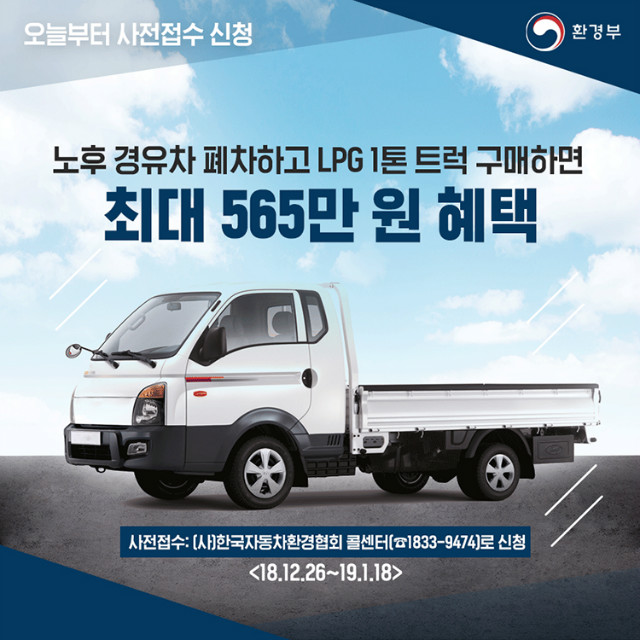 [일간환경연합 김경훈 기자]환경부는 26일부터 내년 1월 18일까지 ‘LPG 1톤 트럭 전환사업’ 사전 신청자를 모집한다.