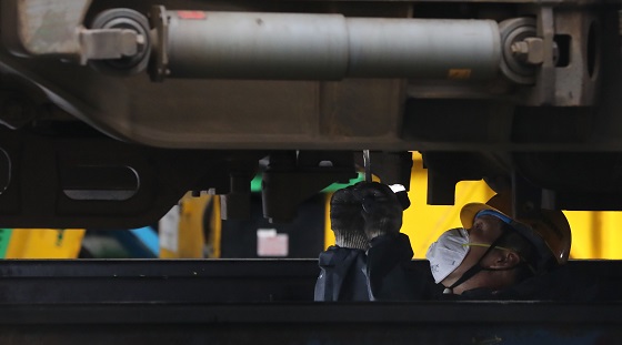 경기도 고양시 수도권철도차량정비단에서 엔지니어가 KTX 열차를 정비하고 있다. (사진=(c) 연합뉴스) |