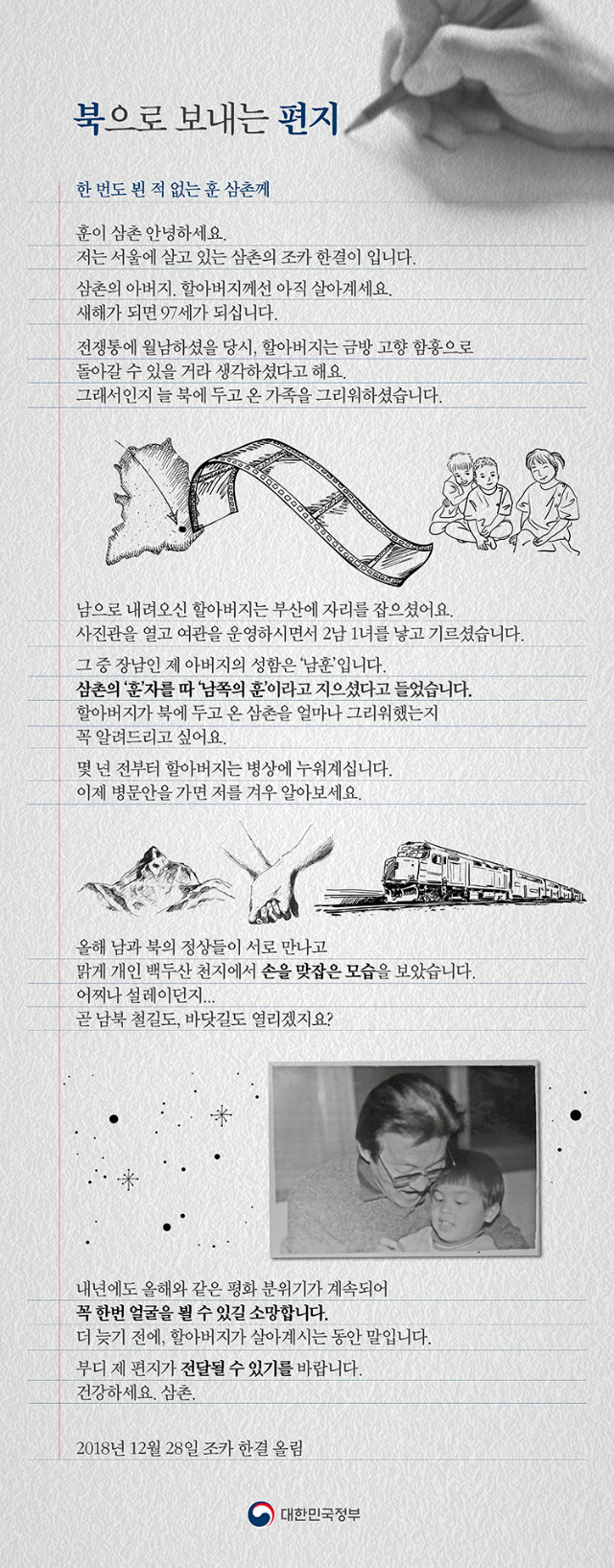 지난 4월 판문점에서 남북 정상이 만난 후, 많은 변화가 찾아왔는데요. 평화가 찾아오는 한반도에서 이산가족들은 어떤 느낌이 들까요? 실제 이산가족의 손자가 북에 계신 삼촌에게 편지를 썼다고 합니다.