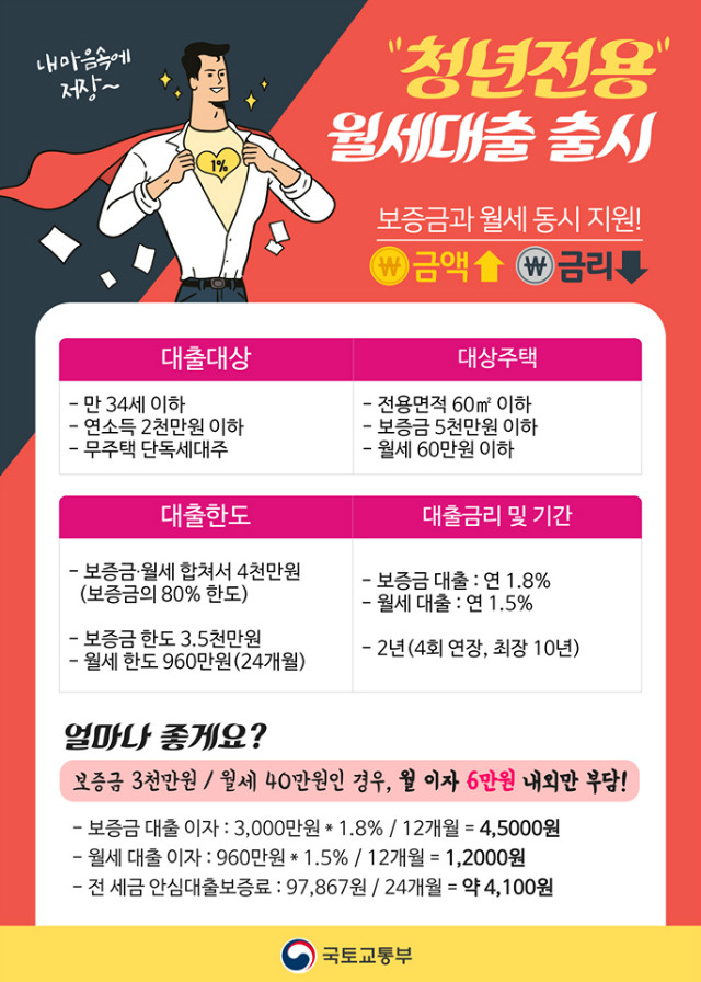 국토교통부는 청년들의 걱정을 조금이라도 덜어주기 위해 청년전용 보증부 월세대출 상품을 출시했습니다. 보증금과 월세를 동시 지원하는 상품은 이번이 처음인데요. 꿀정보를 인포그래픽으로 확인하세요!