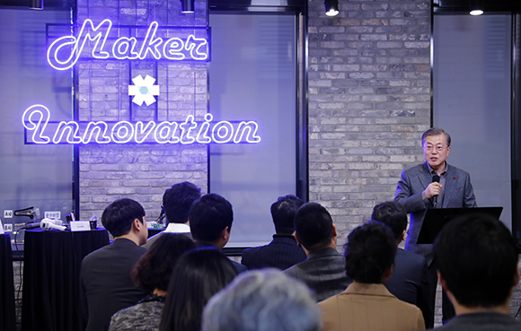 문재인 대통령이 3일 오후 서울 중구 서울스퀘어 빌딩 내 메이커 스페이스 N15를 방문, 연설하고 있다. 문 대통령은 창의적 아이디어 제품화하는 메이커와 제조 스타트업 병행하는 회사를 격려하기 위해 이곳을 방문했다. (사진=(c) 연합뉴스) |