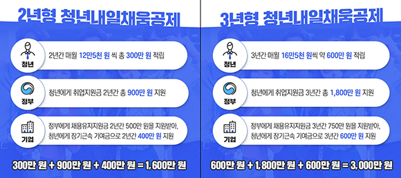 이에 따라 올해는 제도를 개선하면서 2년형 6만명, 3년형 4만명 등 총 10만명의 신규취업 청년을 지원할 방침이다.