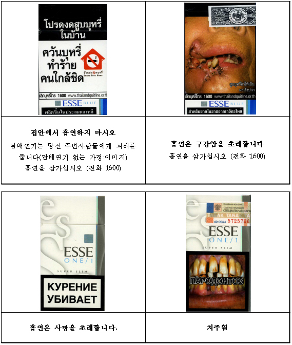 태국(상단)과 러시아(하단)에 수출 중인 에쎄의 흡연 경고그림과 경고 문구