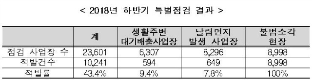 [일간환경연합 한선미 기자]지난해 하반기 '미세먼지 발생 핵심현장'을 특별 점검한 결과, 총 1만 241건이 적발됐으며 이 중 265건이 고발 조치됐다.
