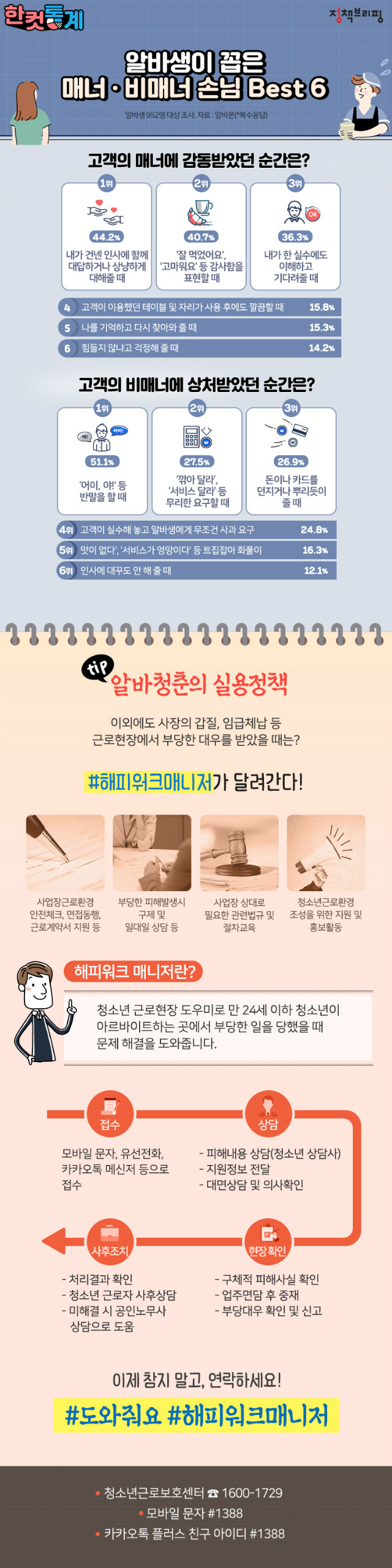 취업포털 잡코리아가 운영하는 알바몬이 알바생 952명을 대상으로 알바 중 만난 매너손님 및 비매너 손님에 대해 설문조사를 실시했어요.