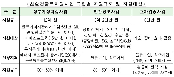 효과검증사업은 물류·화주기업 또는 물류 새싹기업 등이 새롭게 친환경 물류시스템이나 장비를 개발한 경우 미세먼지, 온실가스 감축, 경제적 타당성 등을 검증·지원하는 사업으로 총 6000만 원이며, 시험비 전액을 지원한다.