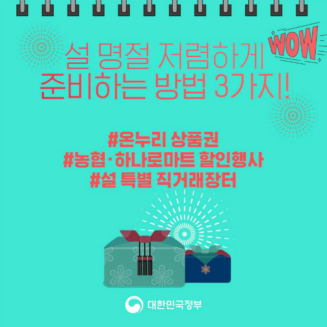 [일간환경연합 신상미 기자]설 명절을 앞두고 준비할게 참 많은데요. △온누리상품권 10% 할인행사 △최대 50% 농협·하나로마트 할인행사 △설 특별 직거래 장터 등을 이용해 차례 음식부터 선물까지 저렴한 가격으로 준비할 수 있는 방법을 카드뉴스로 확인하세요