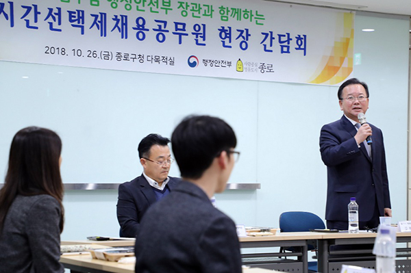 김부겸 행정안전부 장관이 지난해 10월 서울시 종로구청에서 열린 ‘시간선택제 채용공무원 현장 간담회’에서 발언하고 있다. |