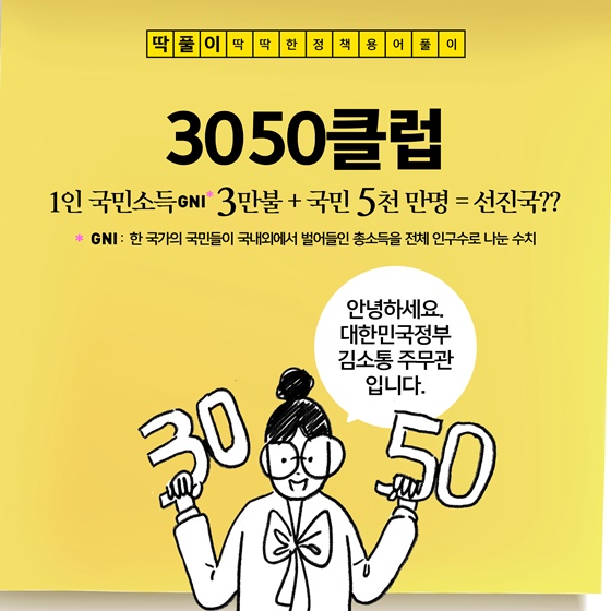 [일간환경연합 김경훈 기자]3050클럽? 홍대에 새로 생긴 클럽인가? 아니죠! ‘3050클럽’이란 국민소득이 3만 달러이면서 인구 5000만 명 이상인 국가를 말합니다. 올해, 우리나라는 3050클럽 조건에 해당되는 나라가 되었는데요. 딱딱한 정책 용어 풀어주는 딱.풀.이 지금 시작합니다!