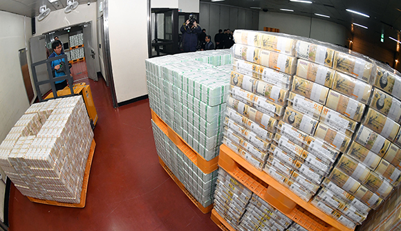 지난해 2월 8일 오전 서울 한국은행 강남본부 지하 금고에서 직원들이 시중은행에 공급할 2018년 설 자금을 방출하고 있다. (사진=(c) 연합뉴스) |